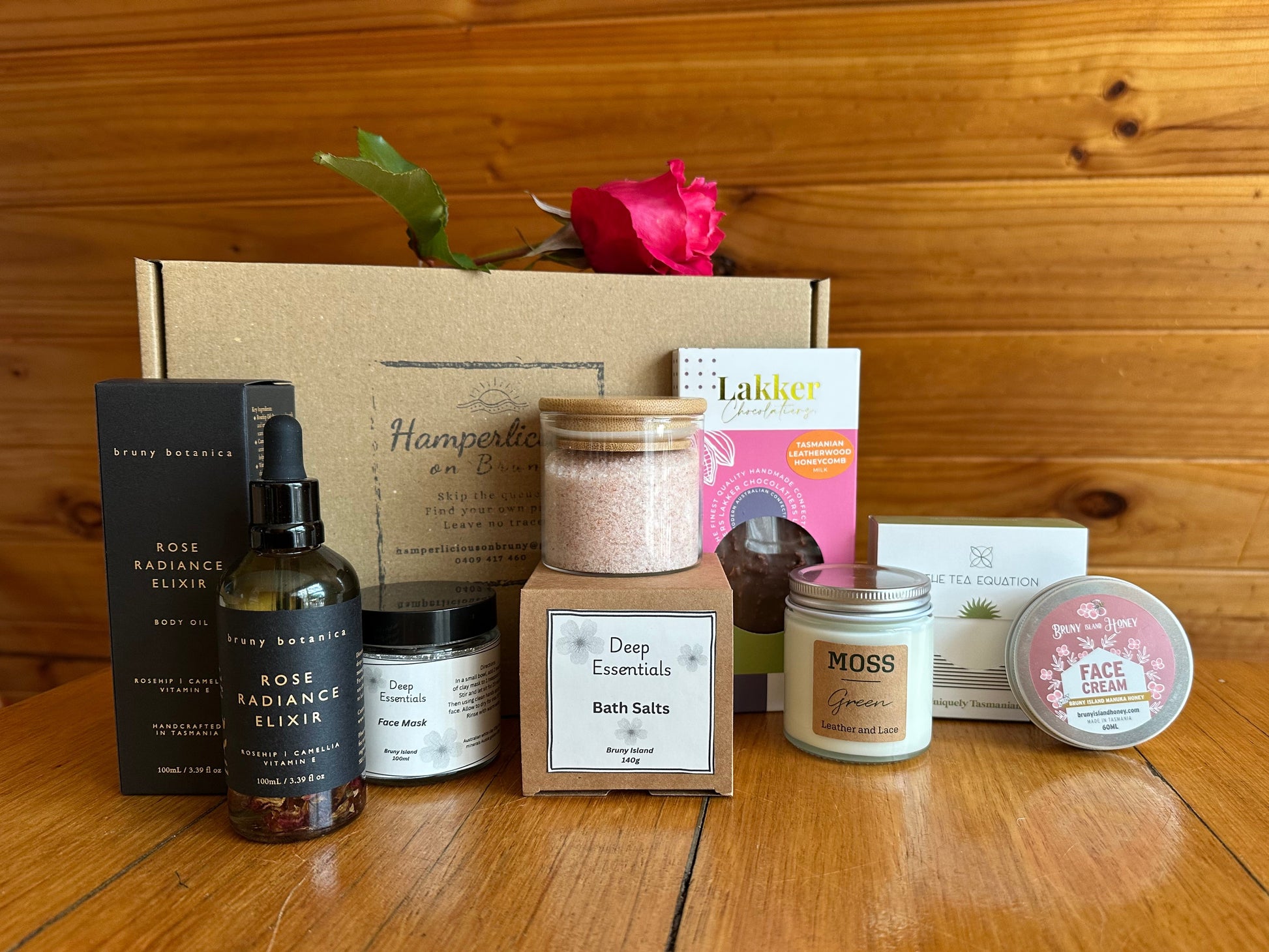 Deep Essential Clay powder face mask, Bruny Island Honey face cream, Deep Essential bath salts, Bruny Botanica Rose elixir body oil, Moss Green candle, Tea Equation herbal tea x 2, chocolate , Josef Chromy sparkling wine (optional)
